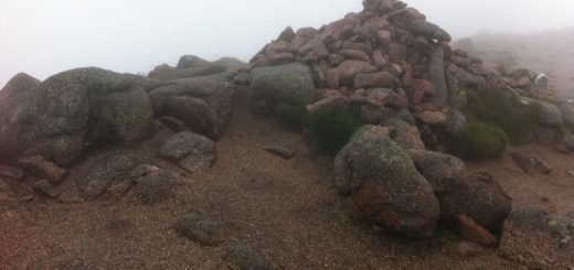 Only one more Munro left. Ben Avon. Its now a couple of km’s across the plateau descending slightly and re-ascending to some smashing tors at the spot height. I was wondering where they were when all of a sudden the mist lifted briefly and showed me the way. As I got past the tors and started on the steep descent to the Bealach The mist lifted giving me my first real views of the day. However it was now 1400 and the wind was blowing from the South East very strongly. I was hoping I would get to Ben Avon before the wind strength increased but it was not to be. The path to Ben Avon was clear in front of me thought so that was a good sign. As I was ascending I met the only walkers I had seen all day coming back down. After a quick chat I continued on my way up to the plateau and then onwards to the clag hidden Ben Avon summit. The wind was ferocious whistling through the tors. I gingerly climbed up the front face to the highest point I could safely touch with an outstretched hand. So safe in the knowledge I bagged the summit I climbed back down to another well earned set of refreshments.