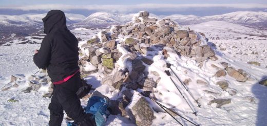 I am thinking that maybe I could attempt the other two Munros, Carn Bhac and An Socach so I follow the ridge east then north to the cairn and then look down into the valley. I go down 50 metres or so but it looks very steep and I can see a snow line below me which I would rather not cross. So I continue East looking for a suitable spot to descend but decide the distance is too great for one day on this occasion. I will do the final two munros from Glen Ey at a later date.