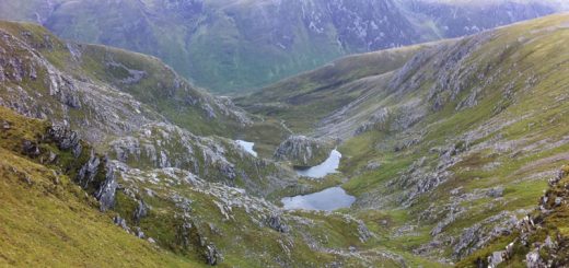 So next it’s an easy drop down past the Lochan heading South West then South to the Bealach again over easy terrain heading for the wall which I could see from quite a distance away. The climb up to the spot height looks quite impressive. There is a path which follows a good line up through the crags, although faint in places, and I had no problems ascending apart from a fatigue setting up in my legs. I was eating and drinking and taking plenty of breaks but I was dog tired. There is a short climb to the summit whereupon I had another rest with more refreshments. I had passed a couple of walkers on the way in but didn’t think I was moving too fast? Its now an easy enough walk to Lurg Mhor dropping and climbing 150m or so and again I was hurting on the ascent. I met another walker coming down from the summit. We discussed routes back out and the consensus was to come back to the lowest Bealach below Lurg Mhor then head North East down to and crossing the Bealach an Sgoltaidh, then head Northish Up to Bealach Crudhain and back to Bealach Bhearnais.