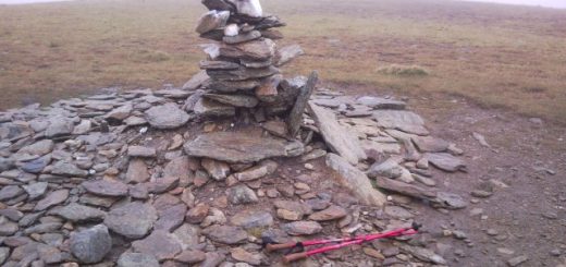 After about 1 hour 10 minutes we reached the 700m point. (it took 1 hour 10 minutes from here to the summit). From here you could clearly see the summit covered in snow. Some peat hags have top be crossed between 700m and 800m but because of the frost in the ground there was very little visible water which made for good going and we made good speed to the snow line at approx 800m. This is when things slowed down a little. The snow was a couple of feet thick with drifts of 4 or 5 feet in places. This meant the lead man had to do all the hard work stepping into the snow and the trail man just followed in these footsteps. We took turns in leading. From 800m to 900m we came across some crags covered in snow and ice. It was a bit hairy ascending some of them and we slowly picked our way through to better ground below the summit. After a short time we reached the summit. A nice sheltered cairn with a trig point in the middle.